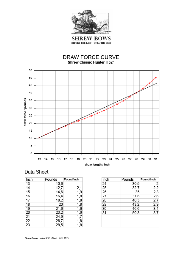 Just check the draw weight curve below to get detailed information about the amazing 52" short Shrew Classic Hunter II.